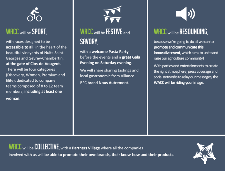 In Burgundy-Franche-Comté, knowing how to live together is a tradition. Around a table, we will celebrate LOCAL GASTRONOMY AND THE PLEASURE OF RENOWNED WINES. The WACC will offer you a beautiful extract of our region, all you have to do is come with your good mood and your desire to get on the bike!